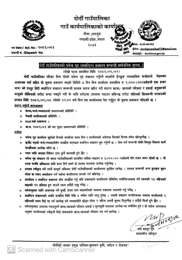 दोर्दी गाउँपालिकाको चमेना गृह(क्यान्टिन) सञ्चालन सम्बन्धी सार्वजनिक सूचना । दोस्रो पटक प्रकाशन