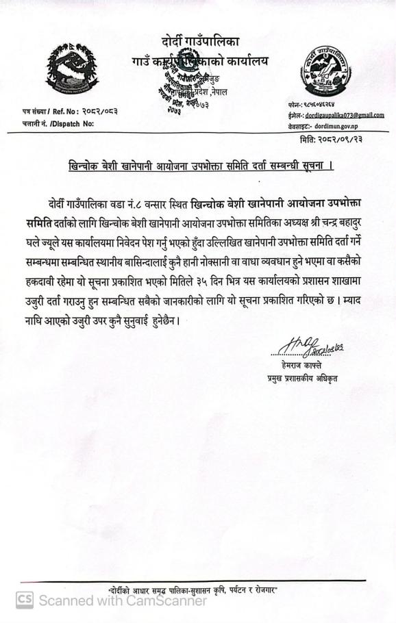 खिन्चोक बेशी खानेपानी आयोजना उपभोक्ता समिति दर्ता सम्बन्धी सूचना .
