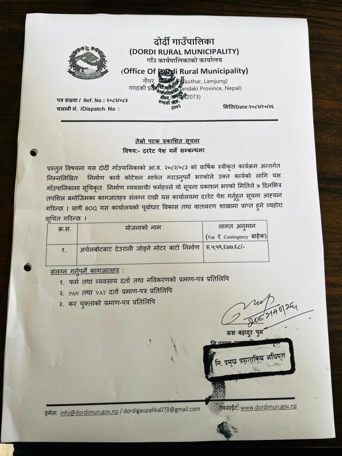 दोर्दी गाउँपालिकाको शिक्षक करारमा पदपूर्ति गर्ने सम्बन्धी सूचना ।