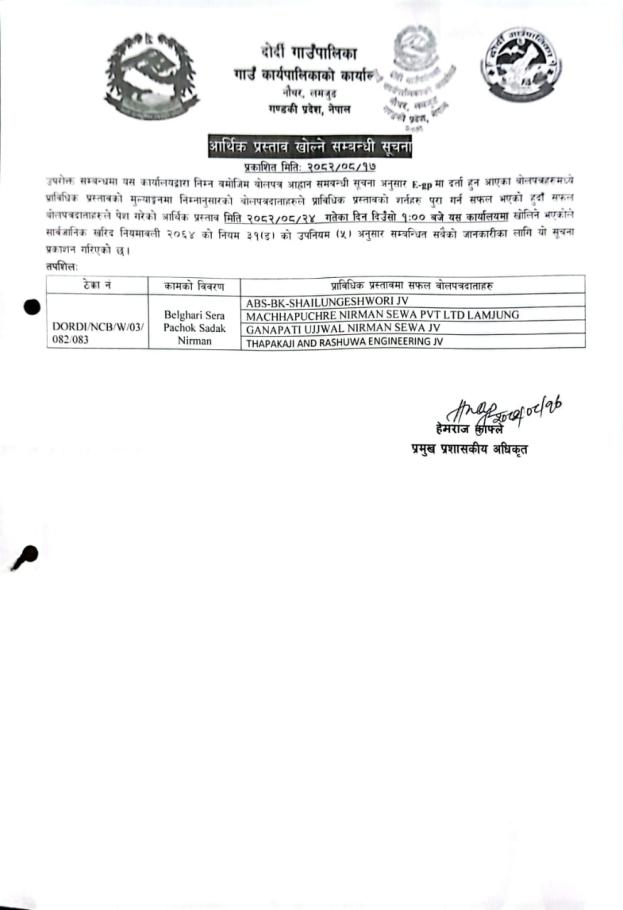 आर्थिक प्रस्ताव खोल्ने सम्बन्धी सूचना