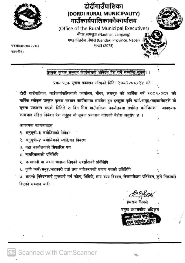 » उत्कृष्ट कृषक सम्मान कार्यक्रममा आवेदन पेश गर्ने सम्बन्धी सूचना ।