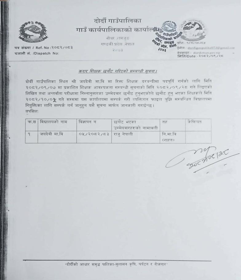 दोर्दी गाउँपालिकाको शिक्षक करारमा पदपूर्ति गर्ने सम्बन्धी सूचना ।