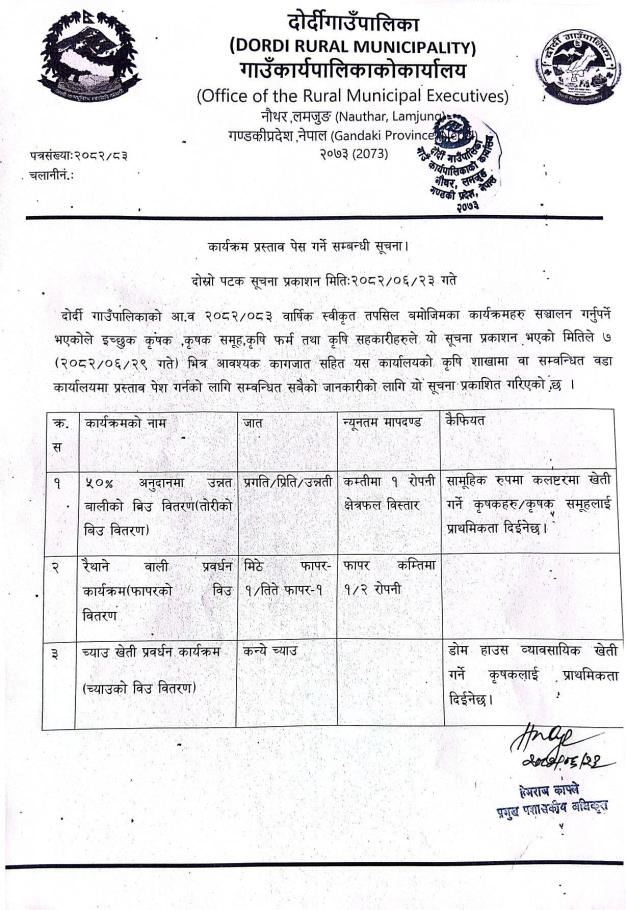 व्यवसायिक अकबरे खुर्सानी खेती कार्यक्रमको प्रस्ताव छनोट भएकोहरुको लागि सम्झौताको लागि तेस्रो पटक मिति थप सम्बन्धी सूचना
