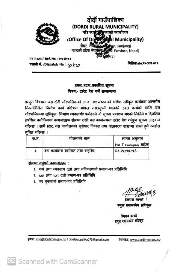 प्रथम पटक प्रकाशित सूचना (दररेट पेश गर्ने सम्बन्धि दोर्दी १ नं का सबै सडक स्तरोन्नति)