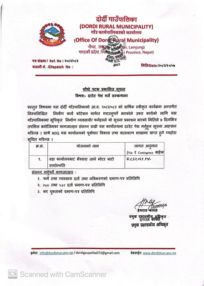 प्रथम पटक प्रकाशित सूचना (दररेट पेश गर्ने सम्बन्धि दोर्दी १ नं का सबै सडक स्तरोन्नति)
