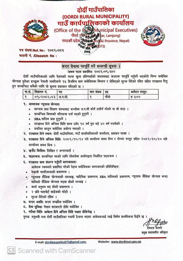 दोर्दी गाउँपालिकाको शिक्षक करारमा पदपूर्ति गर्ने सम्बन्धी सूचना ।